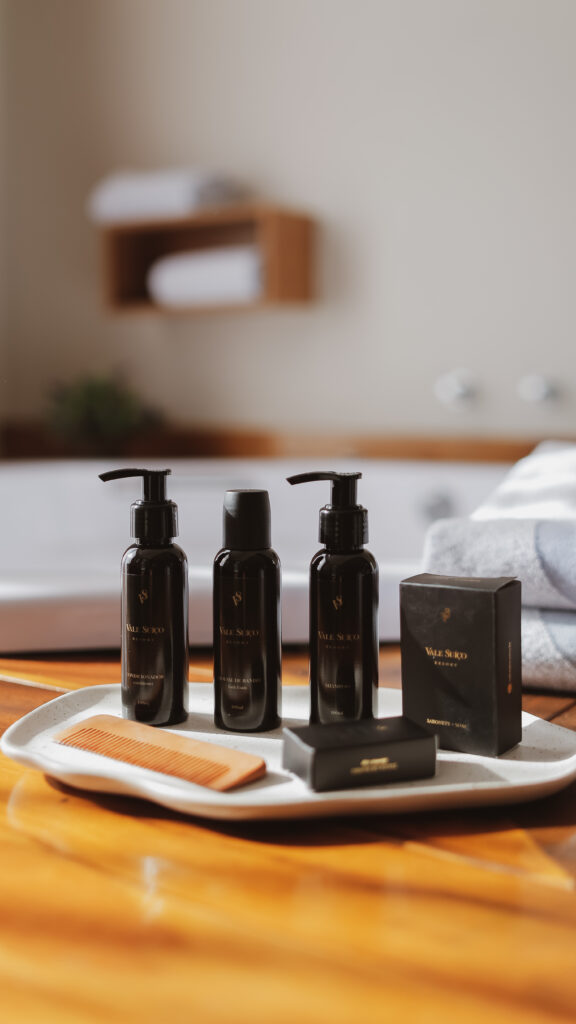 - Compra de produtos: Ofereça ao hóspede a possibilidade de aquisição dos mesmos produtos que ele utilizou no quarto, como toalhas, roupões, velas e demais amenities, como sais de banho, mousse de banho etc.