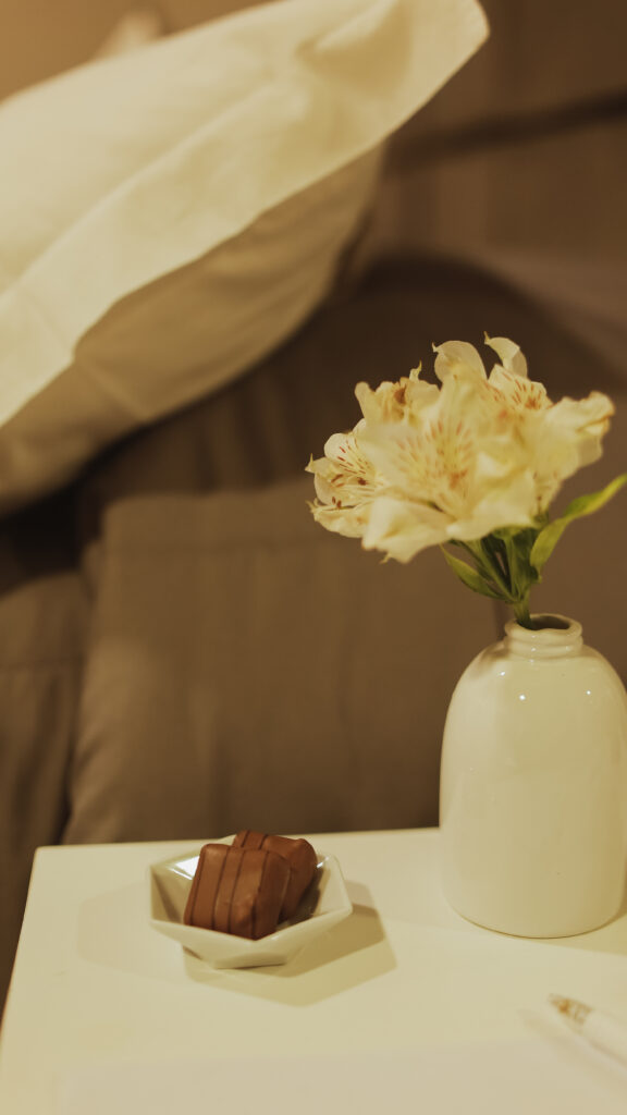 - Mesa de cabeceira: Um pequeno kit com itens essenciais como algodão e lenços de papel demonstra atenção aos detalhes e poderá vir acompanhado de bombons.