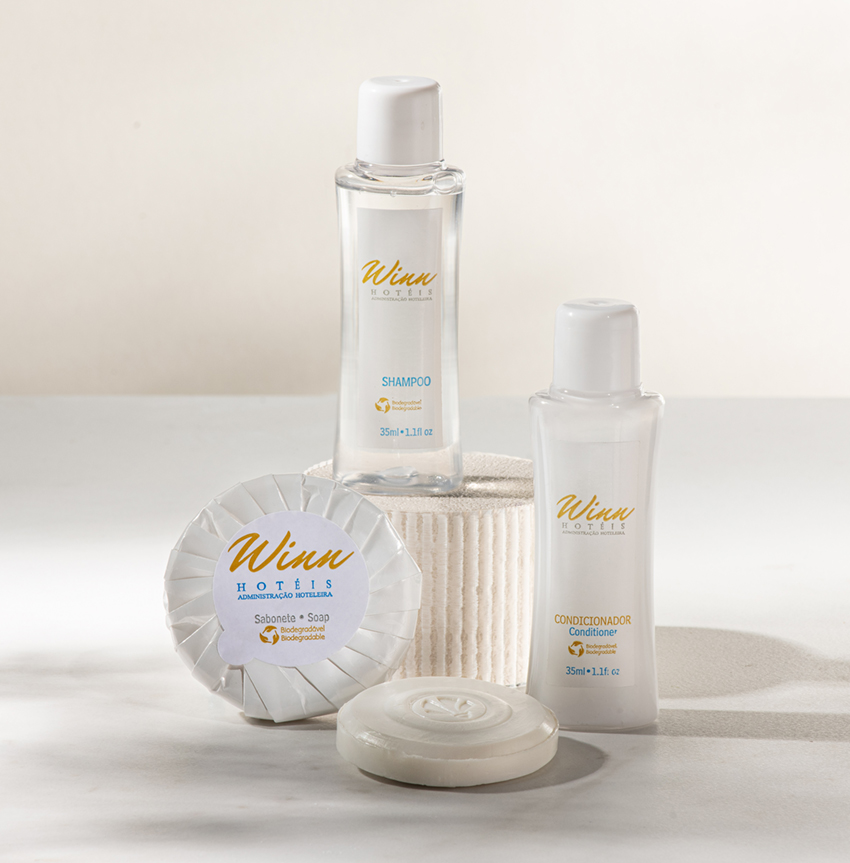 Para hotéis com um público mais econômico, o básico geralmente é suficiente: shampoo, condicionador (ou 2 em 1) e sabonete. A prioridade aqui é oferecer o essencial de forma prática e funcional.